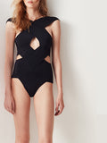 One piece with high neckline and scoop back. Straps crisscross at neck. Cutouts at bust and sides. Bandage-style silhouette. Can be worn off the beach as a bodysuit.