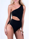 One shoulder cut out one piece. Exposed side zip. Lined. Can be worn off the beach as a bodysuit.